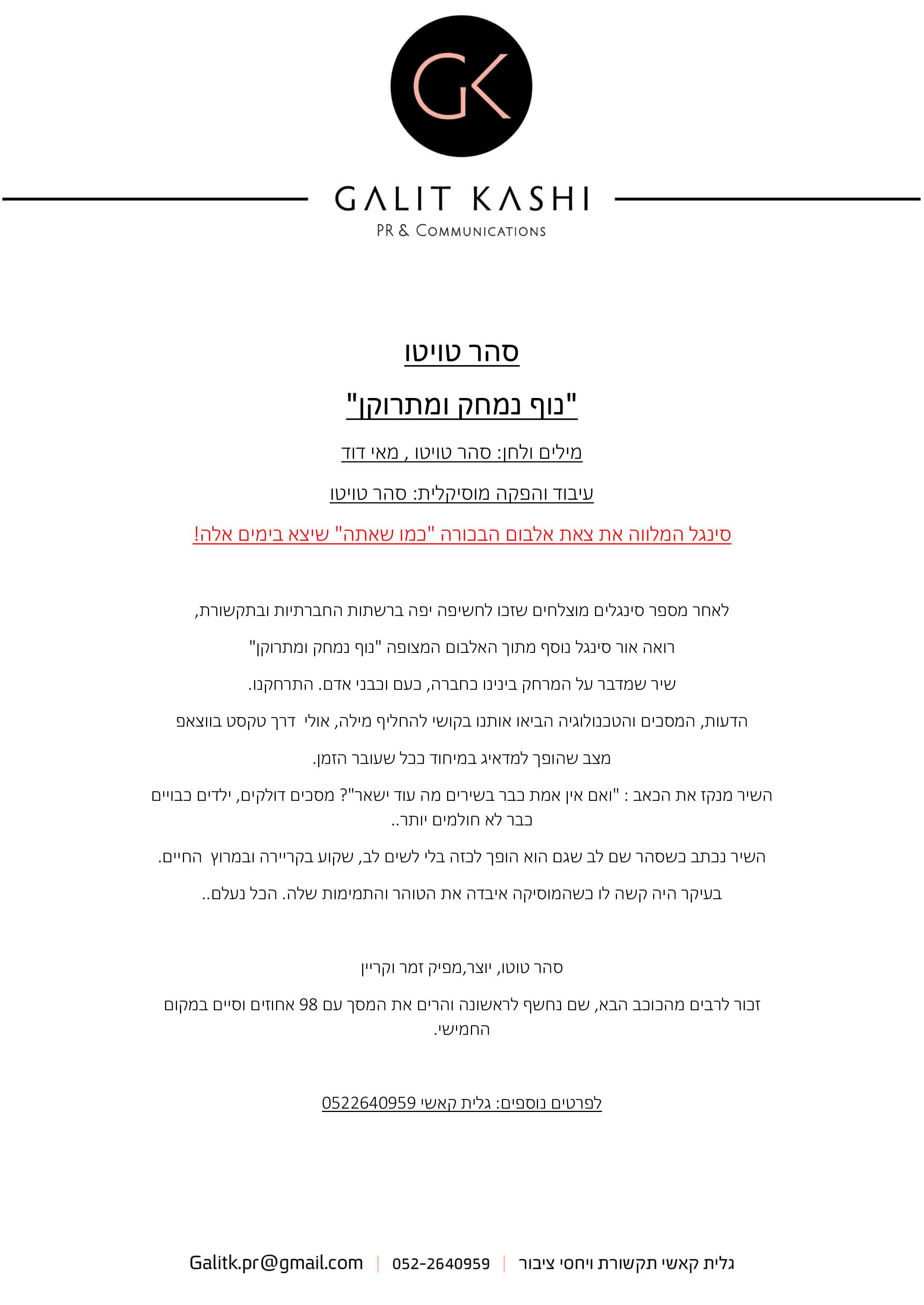 מילים ולחן - סהר טויטו, מאי דוד עיבוד והפקה מוזיקלית - סהר טויטו תופים - גיא גונן מיקס מאסטר - סהר טויטו, רון קרוסבום