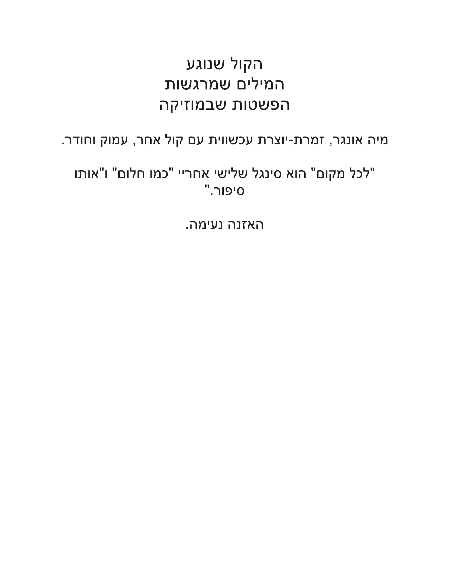 היום אני אשיר לך שיר של נחמה היום אני אוהב אותך כמו ציפור דואה תהיה לי כמו משב של הרוח הקרירה תרקוד איתי באהבה תתן לי עוד שלווה עוד יום בא אני אלך איתך לכל מקום שרק נמצא עד הסוף אני אלך איתך לכל מקום שרק נבחר