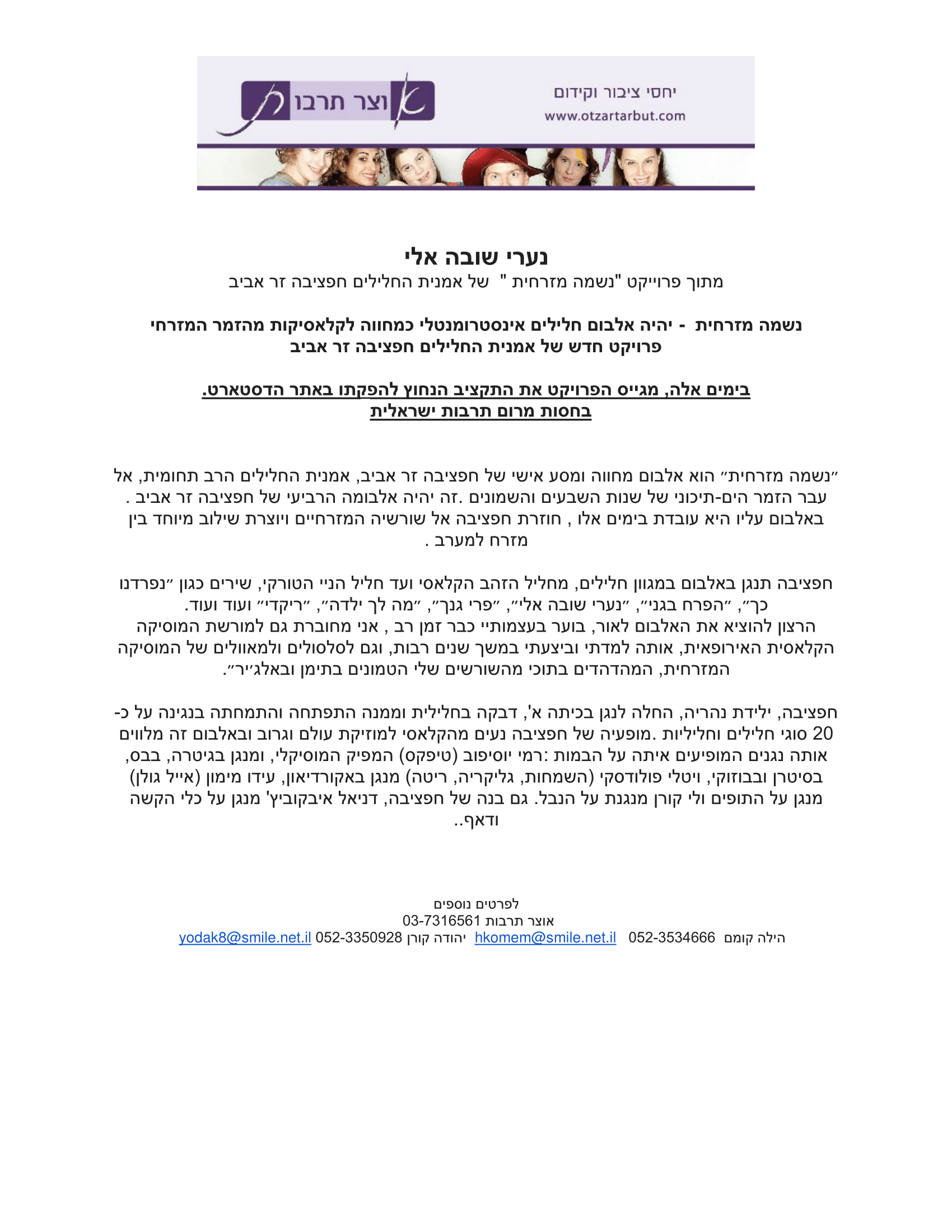 עבור ביצוע ועיבוד כל הזכויות שמורות לחפציבה זר אביב