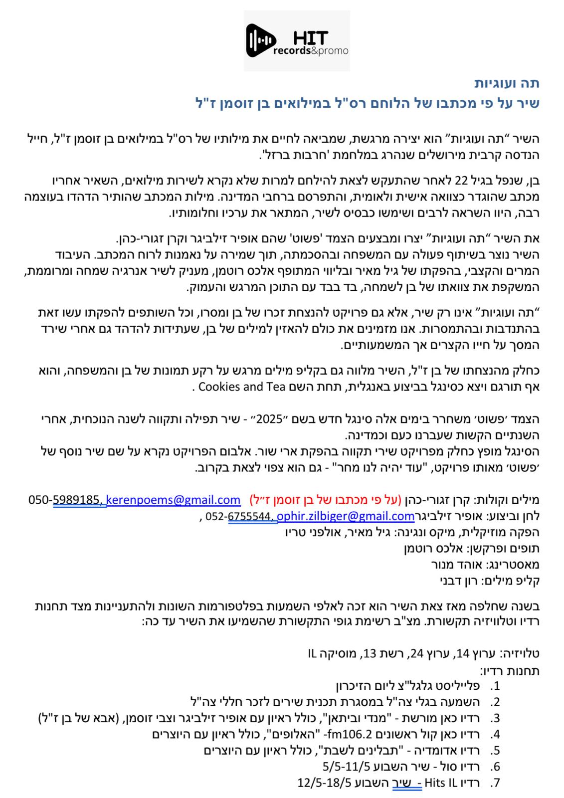 | יחסי ציבור: | היט רקורדס ותקשורת 0523829821 hitrecordspromo@gmail.com |