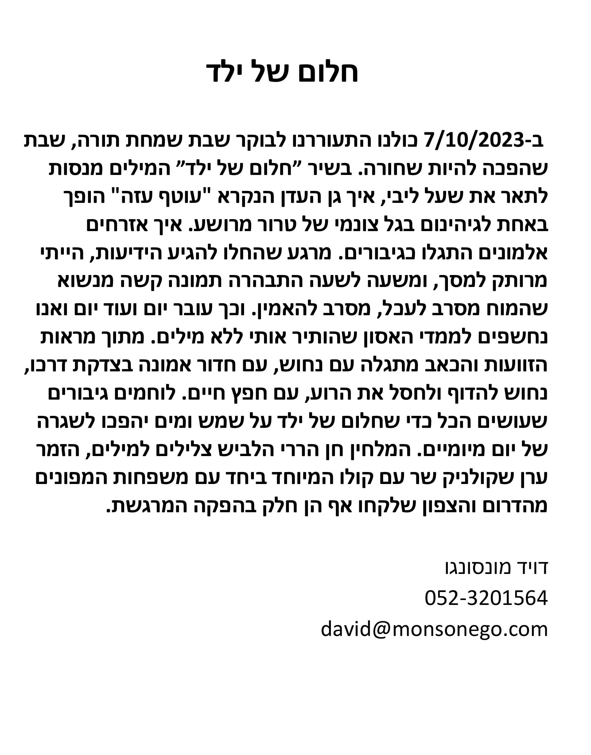 קולות: ערן שקולניק, אביגיל שקולניק, משפחות מפונים: חג'ג', גרימן, שרון, דנינו
