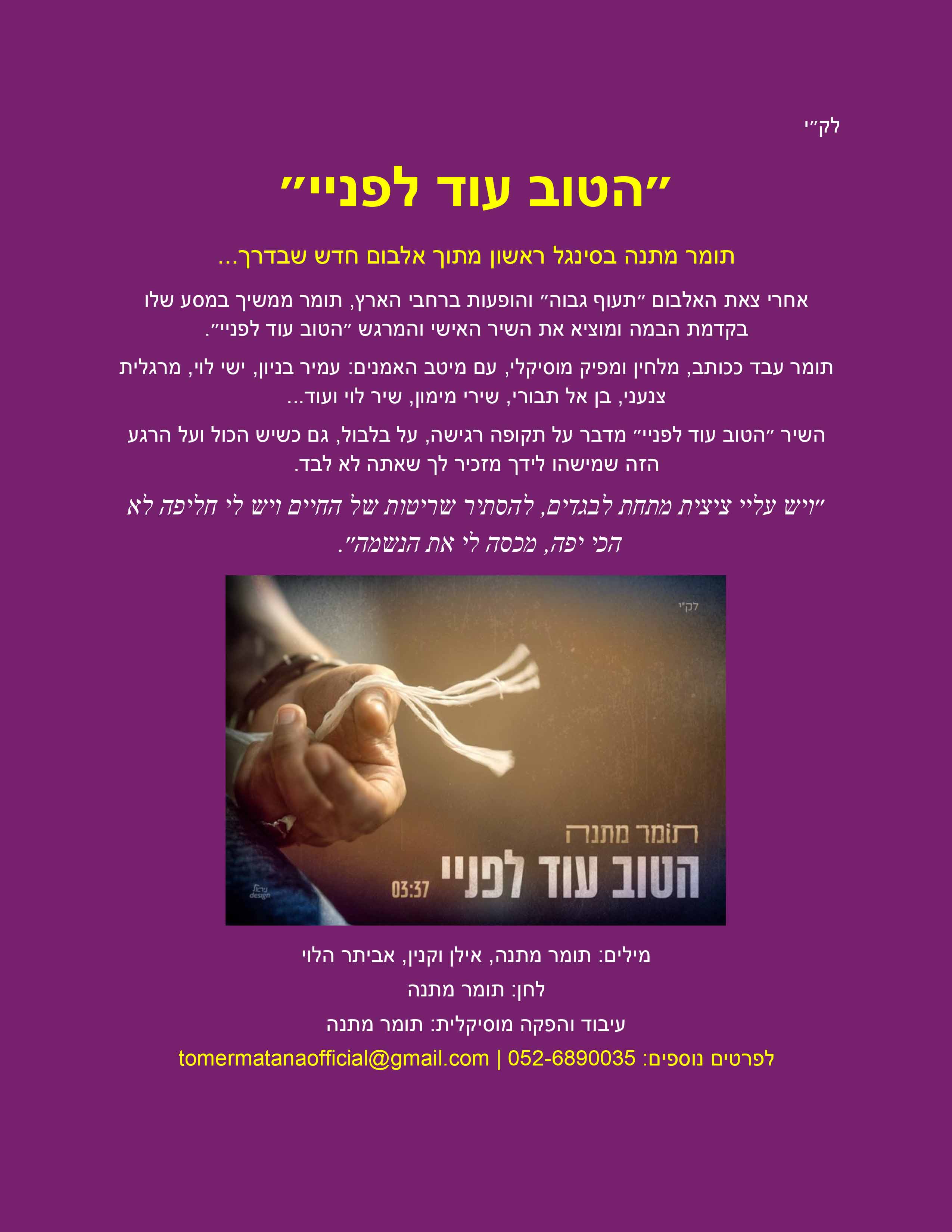 לפרטים נוספים: tomermatanaofficial@gmail.com | 0526890035